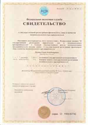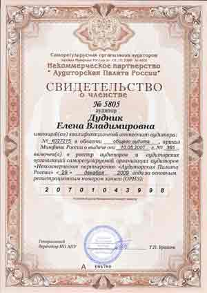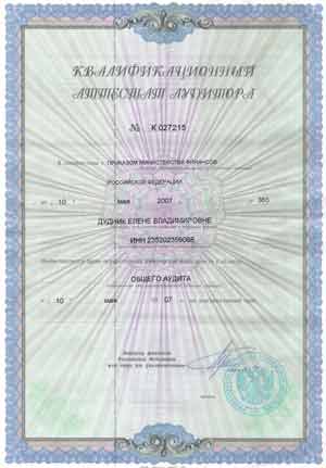 квалификационный аттестат аудитора на право осуществления аудиторской деятельности в области общего аудита Минфина РФ № К027215 от 10.05.2007г., единый квалификационный аттестат аудитора №01-000424 от 23.01.2012г.